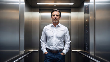 Ready to work. Fair-haired bearded young man going out of the elevator
