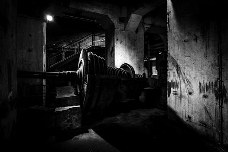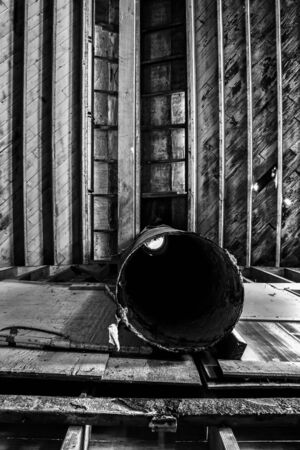 Old rustic machinery with bolts and peeling paint under wood ceiling. Black and white image of abandoned warehouse cannery building in Monterey California.