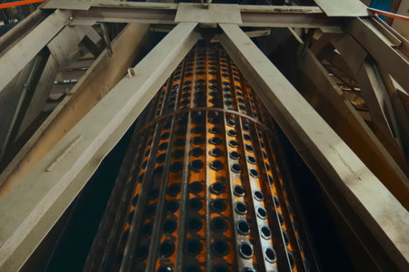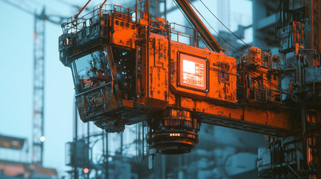 drilling equipment inside a drilling rig on an offshore oil platform. hook, swivel and drill pipes and more