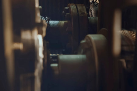 The large circle wheel of the passenger elevator motor in the control room on the top of the building, selectively focused on the first circle wheel, front view with the copy space.