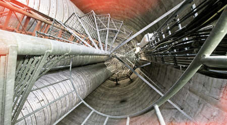 Abandoned Industrial Silo Interior with Metal Staircase, Dramatic Perspective
