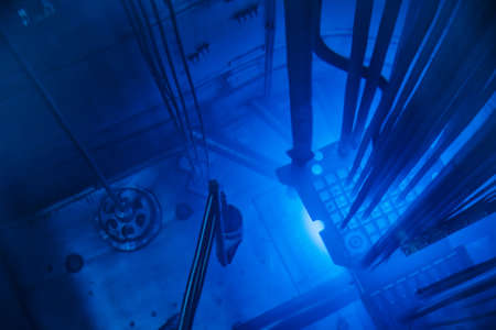 Blue glow water of nuclear reactor core powered, caused by Cherenkov radiation, fuel plates industrial uran