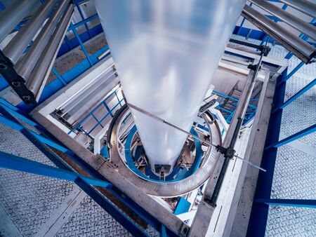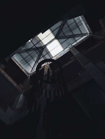 Mine shaft tower situated in the Silesian Museum in Katowice, Silesia, Poland seen from below. Industrial building illuminated spectacularly on the summer evening.