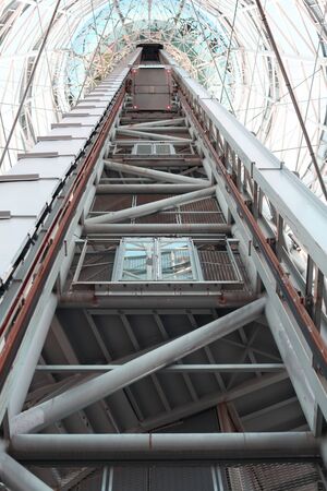 Open elevator lift shaft. Modern architecture with transparent ceiling. Shopping mall or business center. Maintenance repair and service