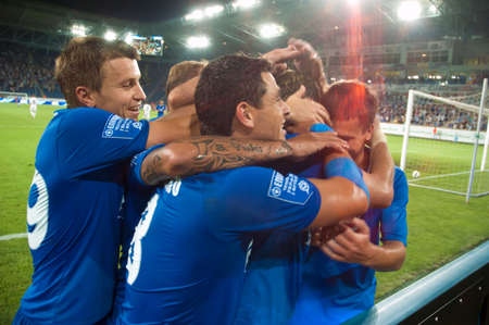 DNEPROPETROVSK, UKRAINE - AUGUST 11: Footballers FC Dnepr celebrate goal during their Uk. Championship game against FC Hoverla on August 11 , 2012 in Dnepropetrovsk, Ukraine