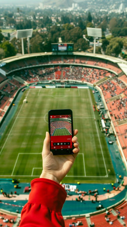Hand with smart phone in a stadium taking pictures of a sporting event