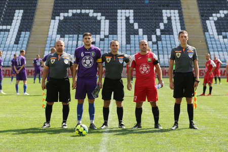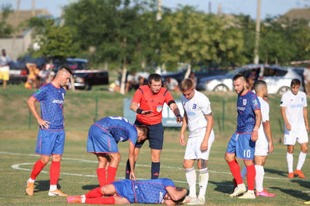 ODESSA, UKRAINE - 07/15/2020 - Fight of football clubs of the first league at the Ukrainian championship. FC BALKANY (Zarya) - FC NIKOLAEV - blue. Game moment while playing big football on the grass