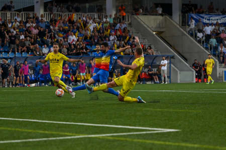 Andorra La Vella, Andorra. 2022 May 22 . Players in action in the match for the first RFEF between FC Andorra 1 vs 0 UCAM Murcia in 2022.