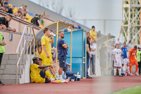 ODESSA, UKRAINE - 07/15/2018: Players of FC Dynamo Kiev on the bench before the start of the UEFA Cup match against FC Shakhtar Donetsk. Footballers on the bench