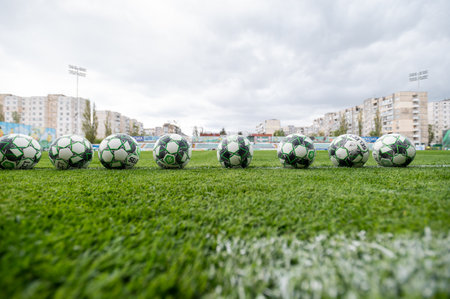 Odessa, Ukraine-circa 2019: the official soccer ball of the tournament season on the grass of the soccer field before the championship game of professional soccer teams