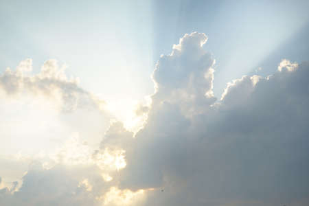 Beautiful blue sky with sun rays coming out of the clouds, heaven. White curly clouds, divine light. The rays.
