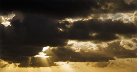 Storm clouds in a dramatic sky with breaking rays of the sun