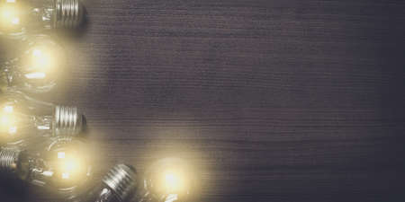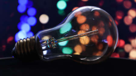 One light bulb lies on a black background with lights in the background. Creative ideas concept. Colorful background with flickering light bulbs. Holiday concept. New Year's and Christmas.