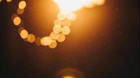 Close up of warm glowing bokeh lights with sparkling dust particles and a soft, golden glow backdrop