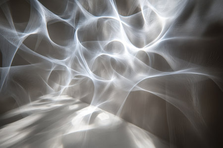 Intricate light patterns form organic shapes on a textured surface in a softly illuminated space.