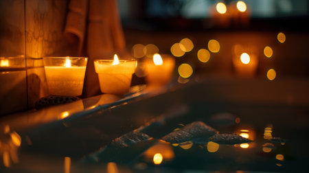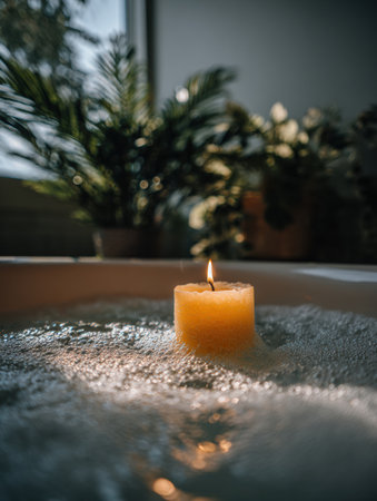 Candlelight flickers gently on the surface of bubbling water in a tranquil bath setting, illuminated by soft natural light and greenery nearby.