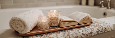 Soft lighting from candles illuminates a serene bathroom setting featuring a towel, a book, and decorative elements on a wooden tray.