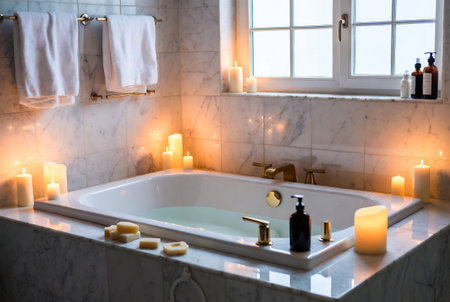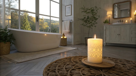An inviting spa scene featuring a sleek white bathtub surrounded by softly glowing candles in various sizes. The ambiance is enhanced by muted indoor lighting and a palette of soothing pastel blues and greens, creating a tranquil environment. Ideal for wellness and relaxation-themed publications or home decor inspiration. AI-generated illustration.