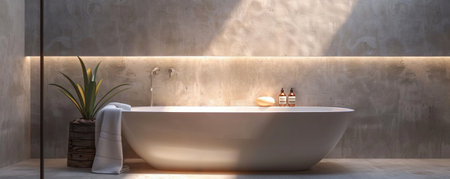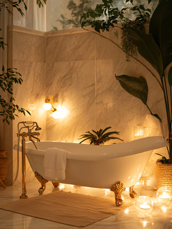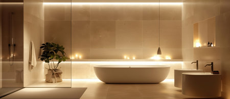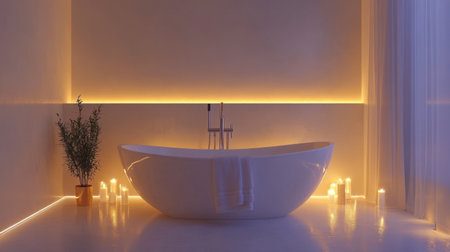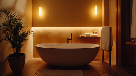 A modern bathroom with a freestanding bathtub, illuminated by warm lights and adorned with spa-like elements like candles and towels on the side counter. The room is bathed in soft lighting from above, creating an atmosphere of relaxation and luxury. A potted plant adds greenery to the space, enhancing its serene ambiance. --chaos 30 --ar 16:9 --stylize 750 --v 6.1 Job ID: b024180a-d13a-4db8-8d42-d794929d7316