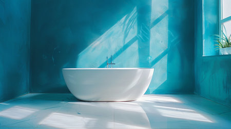 A minimalist white bathtub set in a blue room, with natural light casting shadows. The clean and modern design is ideal for themes related to interior design and bathroom decor.