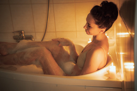Young woman relaxing in the beautiful vintage bath full of foam in the retro bathroom decorated with candles.