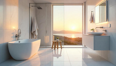 A bright and luxurious modern bathroom interior, flooded with natural sunlight from a large window. It features a white freestanding bathtub, a marble vanity with two sinks, folded white towels, natural sea sponges, and a potted plant.