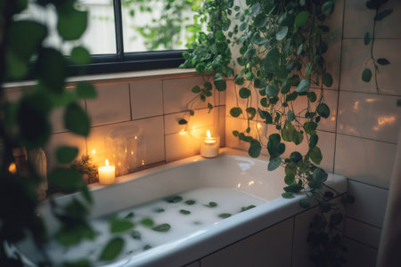 Warm water with eucalyptus leaves and foam, surrounded by candles and string lights, creating a cozy and relaxing atmosphere in a modern bathroom