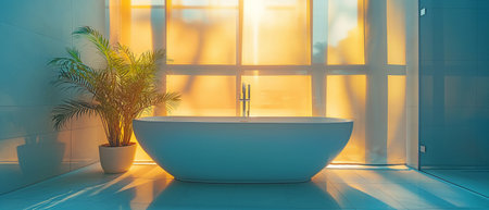 A bathroom with a bathtub and a plant in it. AI generative image.