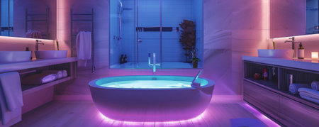 A magical modern bathroom, featuring LED strips that create a vibrant and soothing light around the bathtub, vanity, and stylish decor, enhancing the luxurious feel.