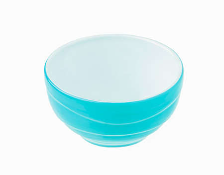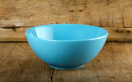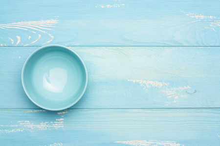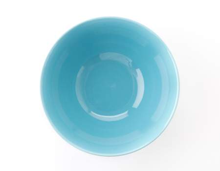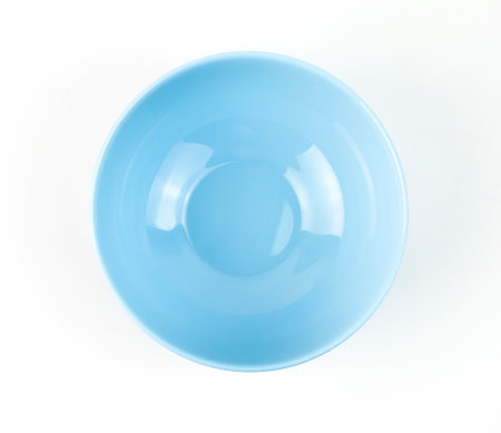 A blue ceramic bowl is shown from a top perspective, smooth and round