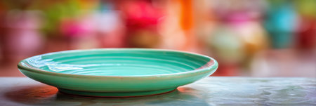 Turquoise plate sits on a smooth surface, surrounded by a colorful backdrop featuring abstract shapes and soft lighting, creating a lively ambiance.