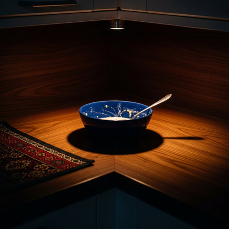 Empty ceramic bowl and spoon on a table in the kitchen at night