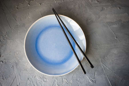 Rustic table setting with ceramic plate and bowl and wooden chopsticks