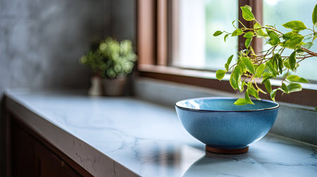 This serene image features an elegant blue bowl placed on a marble countertop, complemented by a fresh green plant. Ideal for modern kitchen decor.