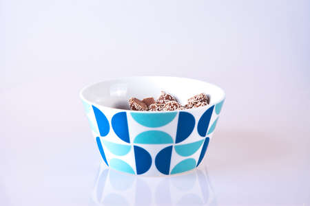 A blue ceramic mattle deep bowl for breakfast flying on blue background. Ideal photo for levitation of food and fruits or nuts.