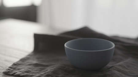 Blue ceramic bowls on the table, shallow depth of field with sunlight