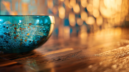 A close-up of a decorative glass bowl with intricate patterns, placed on a wooden surface. Perfect for themes of interior design, decor, and craftsmanship.