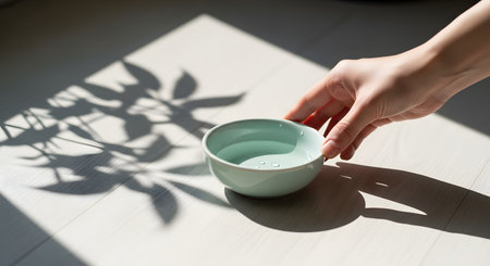 A hand placing a small celadon tea cup on a light table, surrounded by intricate leaf shadows. The minimalist composition evokes a sense of zen, peace, and aesthetic beauty.