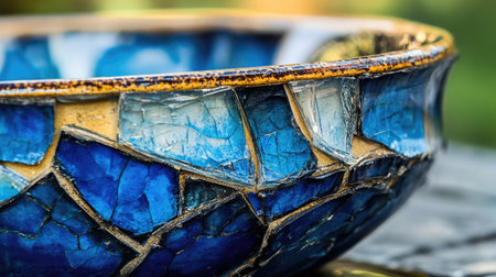 Close-up view of a beautifully crafted ceramic bowl featuring a vibrant blue mosaic design. The intricate textures and artistic details create a stunning visual effect, perfect for outdoor settings.