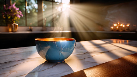 A serene scene featuring a blue ceramic bowl emitting steam, placed on a luxurious marble countertop, with warm sunlight pouring in through a window, creating a tranquil kitchen atmosphere.
