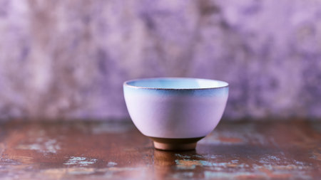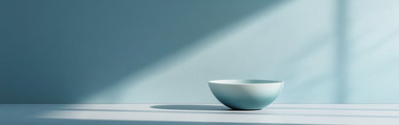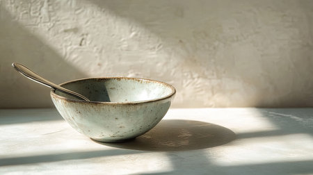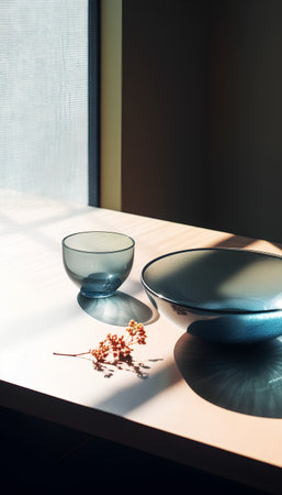 A handcrafted ceramic bowl filled with pure water sits on a reflective surface, catching the soft morning sunlight. This tranquil scene evokes a sense of calm, mindfulness, and simple beauty, perfect for concepts of wellness, spa, and peaceful living.
