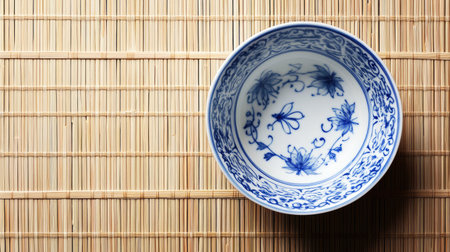 This elegant blue and white porcelain bowl features intricate floral designs, resting on a bamboo mat, perfect for enhancing any dining or decorative setting.