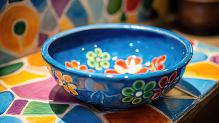 A vibrant blue bowl featuring colorful flower designs rests on an artistic tiled surface, perfect for showcasing culinary delights or enhancing decor.