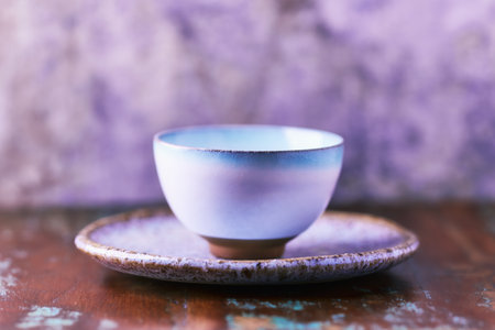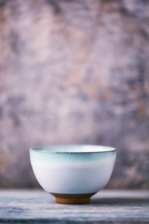 Traditional japanese ceramic on rustic wooden background. Soft focus. Copy space.