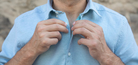 Man wearing summer shirt with short sleeves.