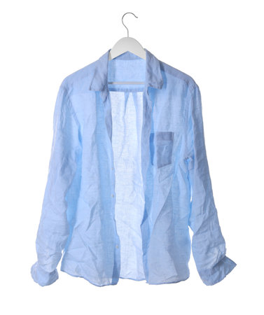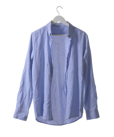 Hanger with light blue creased shirt isolated on white