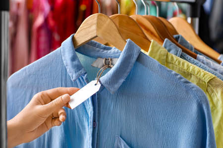 Female hand and blank paper label on shirt