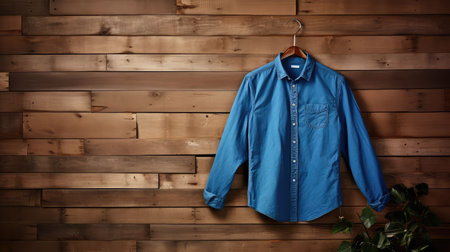 Light blue shirt with long sleeves. Formal shirt on wooden background. Beautiful buttoned blue shirt on sale.
