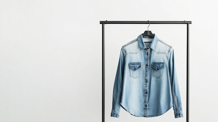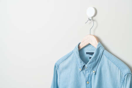 hanging jean shirt with wood hanger on wall