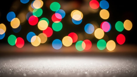 Surface. showing bokeh lights background with a vibrant mix of circular shapes in yellow, blue, purple, and green scattered across a sparkling, glittery dark...